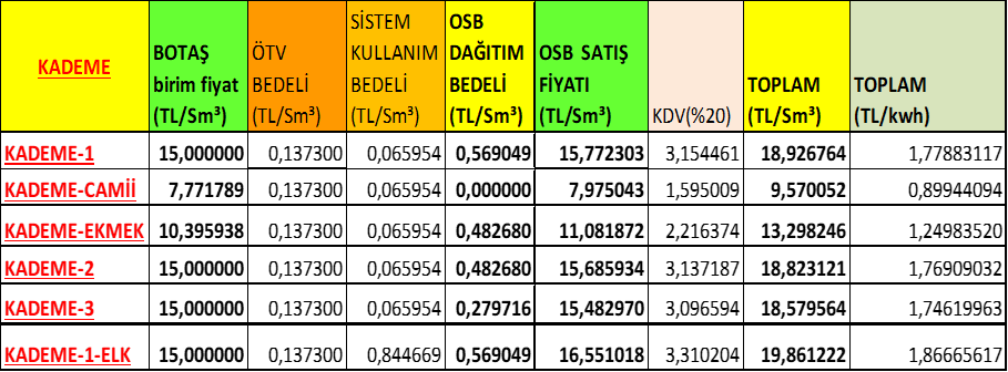 Elektrik üretim amaçlı kullanım, tüm kademeler için   herhangi bir değişiklik yapılmamıştır.  (OSB-4 için mevcuttaki alış ve satış fiyatımız 15,000000 TL/Sm3)