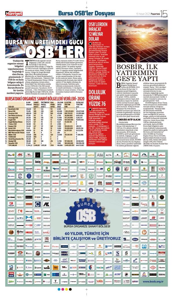 'Bursa Organize Sanayi Bölgeleri' başlıklı dosya çalışması Hürriyet ve Milliyet Gazeteleri tarafından 19 Nisan 21 Pazartesi günü yayımlandı. Her iki gazetedeki çalışmada, Bursa'nın üretim merkezleri olan organize sanayi bölgeleri ile ilgili istatistiki bilgiler ve OSB'lerin yatırım, proje, sosyal sorumluluk, ihracat, istihdam gibi yarattığı faydalar da geniş şekilde anlatıldı.