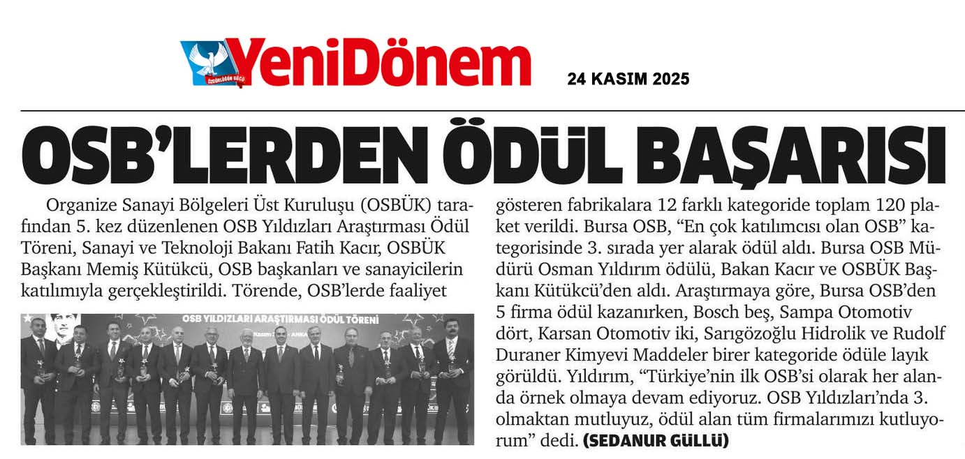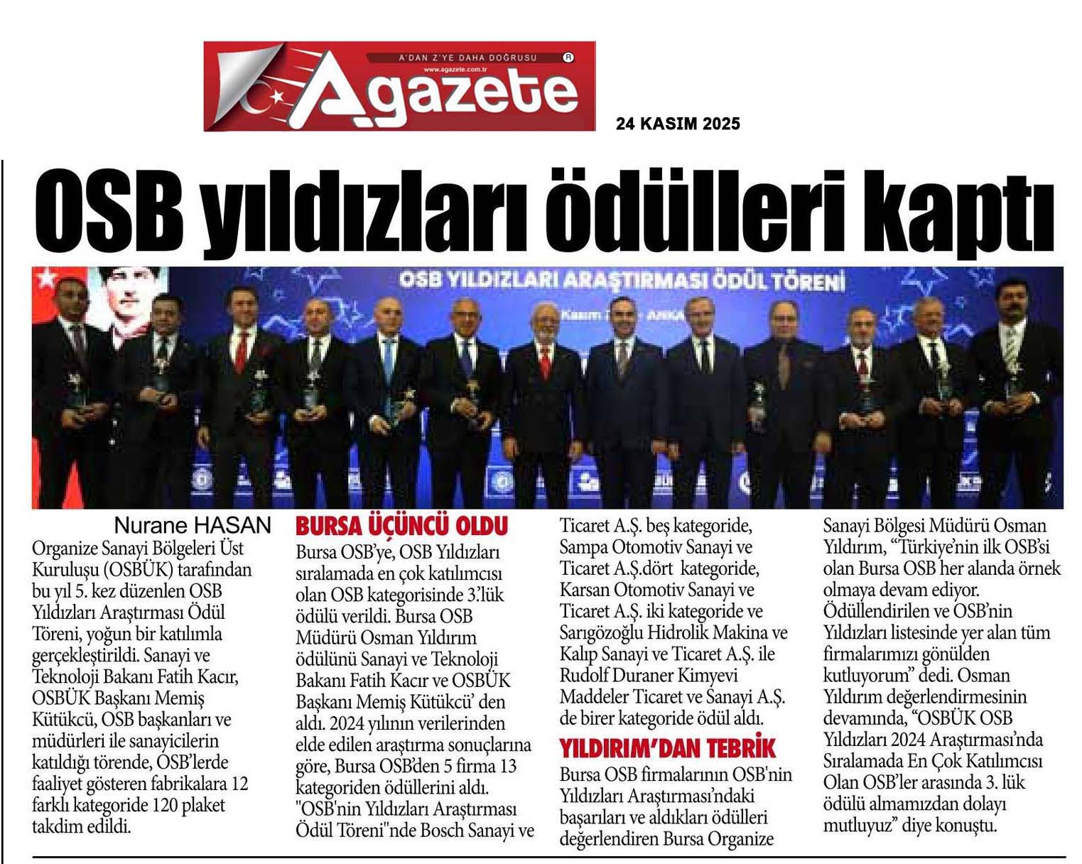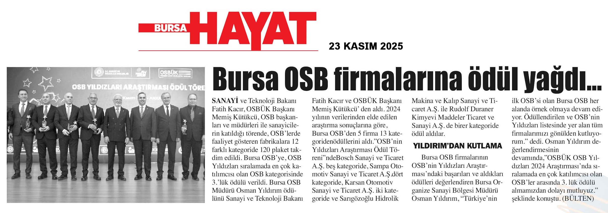 2024 yılının verilerinden elde edilen araştırma sonuçlarına göre, Bursa OSB’den 5 firma 13 kategoriden ödüllerini aldı. "OSB'nin Yıldızları Araştırması Ödül Töreni"nde Bosch Sanayi ve Ticaret A.Ş. beş kategoride, Sampa Otomotiv Sanayi ve Ticaret A.Ş.dört kategoride, Karsan Otomotiv Sanayi ve Ticaret A.Ş. iki kategoride ve Sarıgözoğlu Hidrolik Makina ve Kalıp Sanayi ve Ticaret A.Ş. ile Rudolf Duraner Kimyevi Maddeler Ticaret ve Sanayi A.Ş. de birer kategoride ödül aldılar.