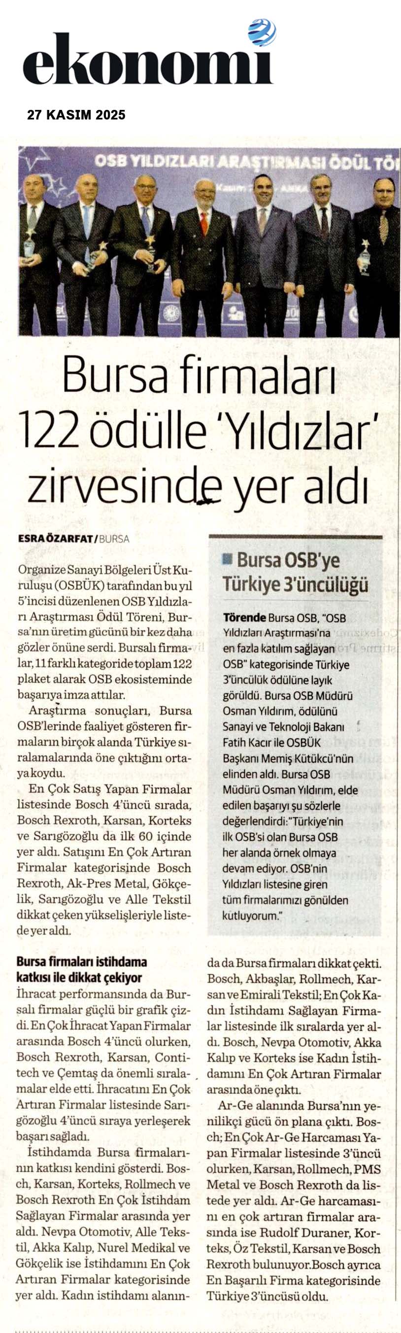 Bursa OSB, OSB Yıldızları sıralamada en çok katılımcısı olan OSB kategorisinde 3.’lük ödülü aldı. Bursa OSB Müdürü Osman Yıldırım ödülünü Sanayi ve Teknoloji Bakanı Fatih Kacır ve OSBÜK Başkanı Memiş Kütükcü’ den aldı.